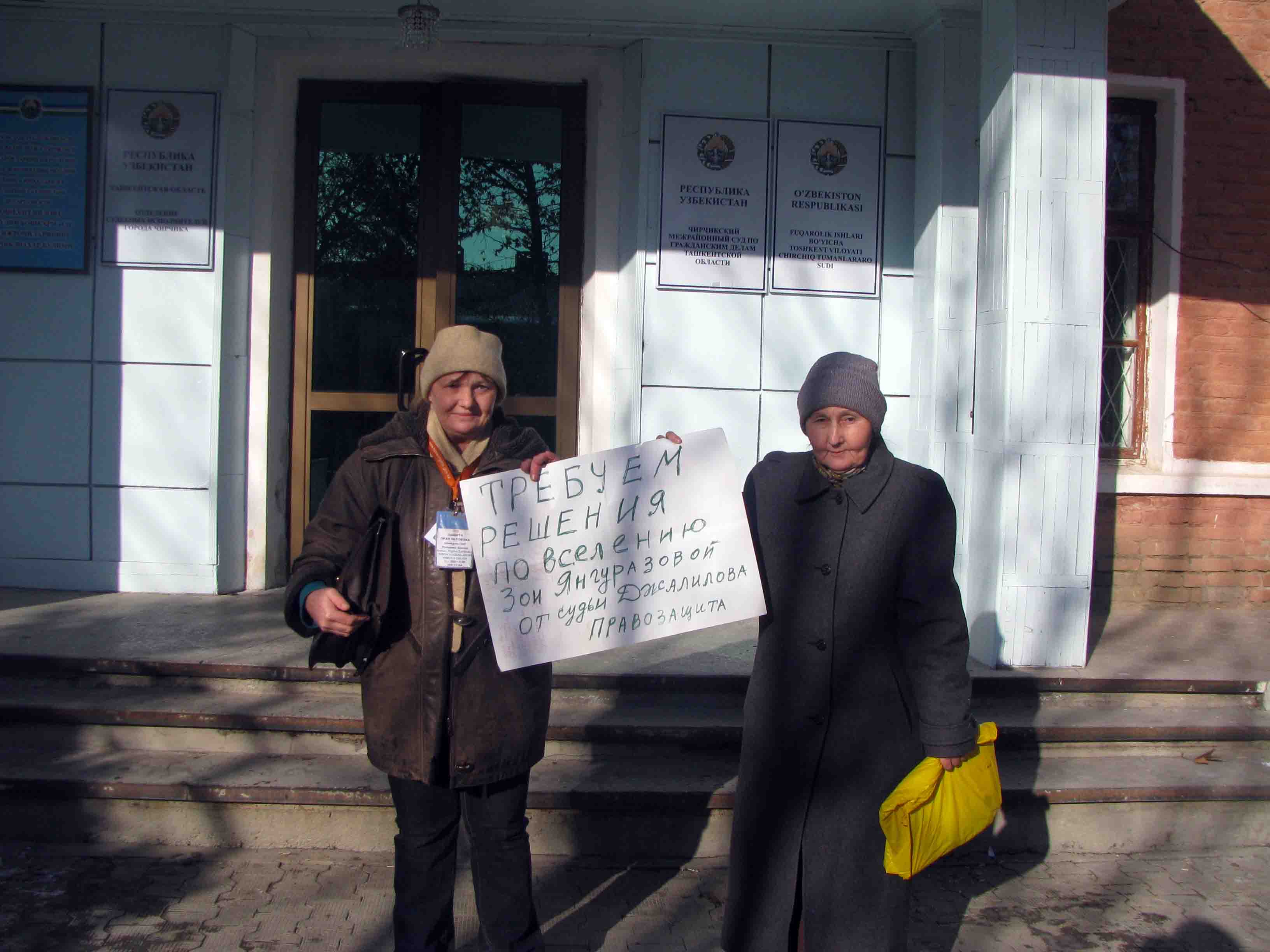 Ҳуқуқ ҳимоячилари Елена Урлаева ва Зоя Янгуразова турар жойни Янгузарова Зояга қайтариш ҳақида чиқарилган ва декабрнинг бошида берилиши керак бўлган қарор судья Джалилов томонидан  берилмаётгани юзасидан норозилик билдириш учун Чирчиқ судига келишди. Пикетдан сўнг ҳуқуқ ҳимоячилари  қабулга ва шикоятлар топшириш учун судга келган ва суд биносига  киргазилмаётган  фуқаролар тўпини орасидан ёриб  ўтиб суд биносига киришди. Суд биносида ҳам одам кўп эди. Болали аёллар   2 соатдан бери йўлакда  кутишга мажбур қилинаётганидан ғазабланишарди. Судья Джалиловнинг котибаси милиция чақириш билан таҳдид қилди ва милиция чақирилди. Урлаева Е.ни шу суднинг раиси Холиқовнинг кабинетига олиб боришди.Холиқов  фуқароларни, биринчи навбатда болали фуқароларни, қабул қилишга буйруқ берди,аммо бошқа кўпгина фуқаролар каби Янгуразова З.га ҳам   суд қарори яна  берилмади.