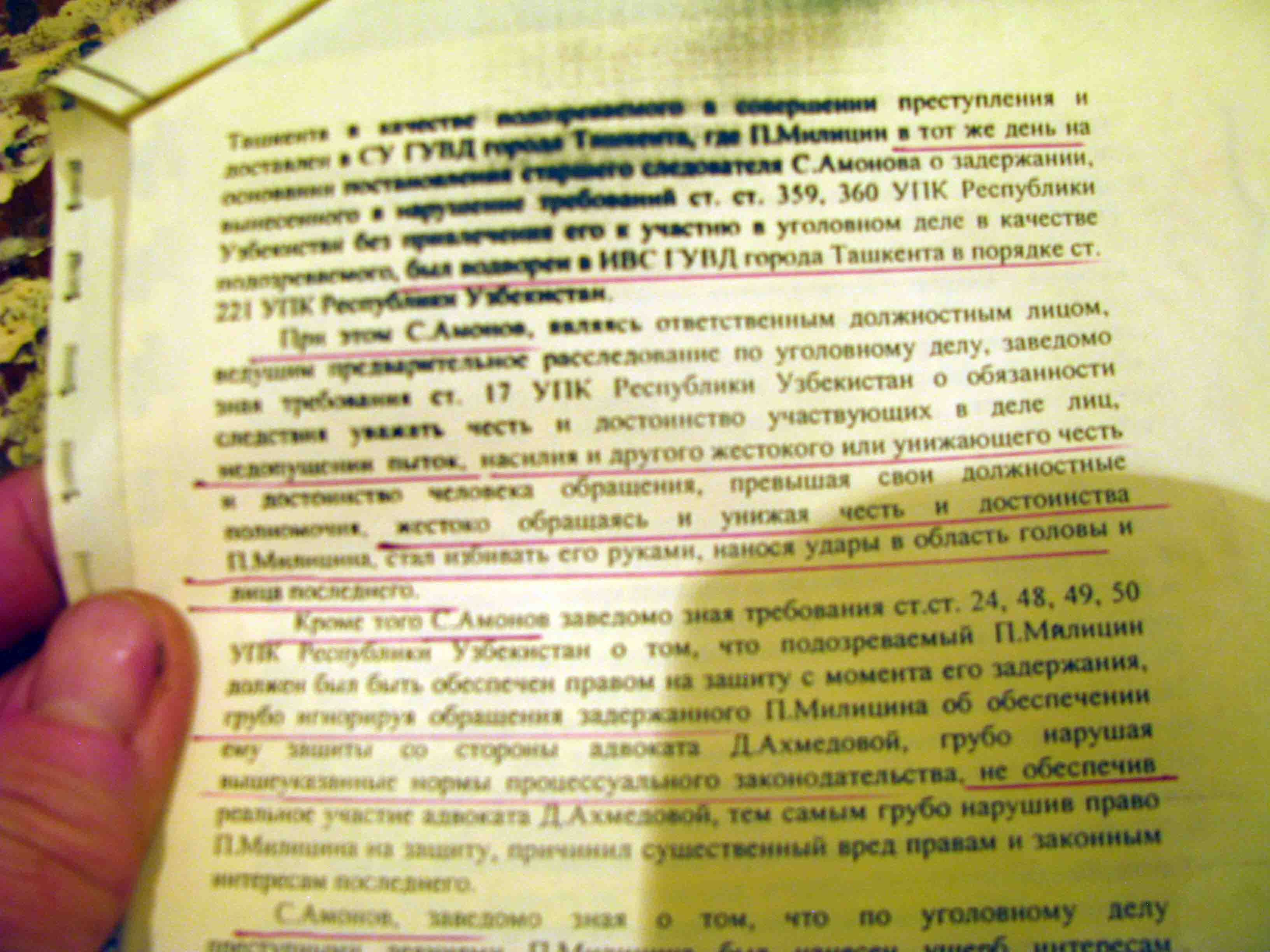 В пресс- центр Альянса обратились супруги Милицин Пётр и Латунина Татьяна, которые сообщили, что по указанию сотрудника МВД РУз Иванникова Павла милиционеры ГУВД г. Ташкента 19 апреля 2005 года незаконно арестовали Милицина Петра по якобы возбужденному в отношении еог уголовному в отношении его.