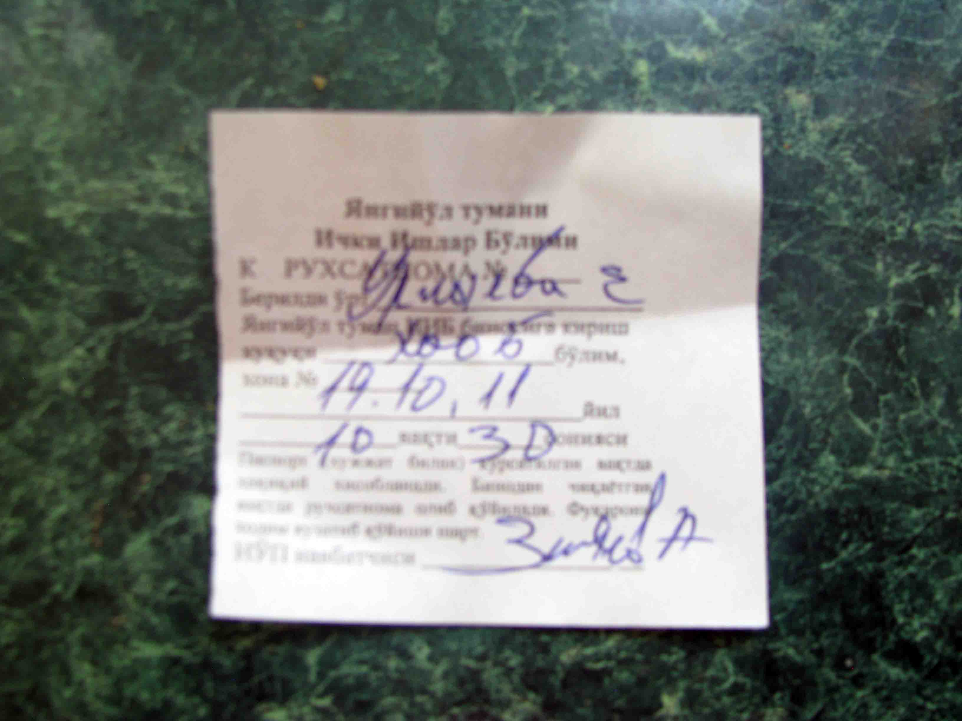 В такси я обнаружила в моей сумке какие то печатные листы в количестве более 50 штук, некоторые за подписью начальника Янгиюльского ГОВД, некоторые какие-то данные уголовных дел, списки милиционеров с их телефонами, списки арестованных, много с ножевыми ранениями. Некоторые фото прилагаю, хотя многие люди советовали мне счечь эти материалы во избежания каких то провокаций со стороны милиции.