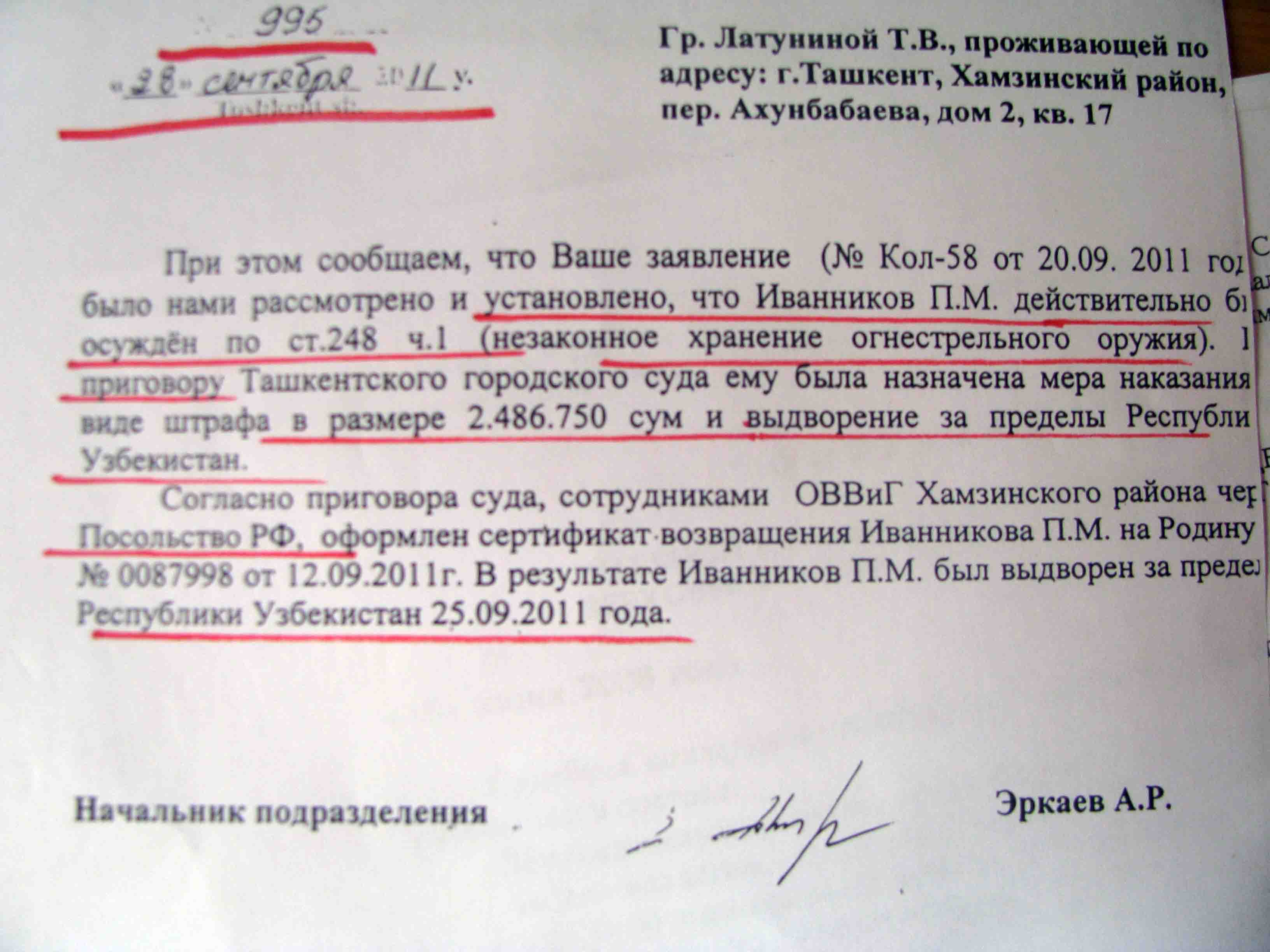 Однако Иванникову Павлу удалось подкупить судью Эрматова Б. Мирабадского уголовного суда г.Ташкента, который для избежания уголовного наказания в материалах уголовного дела написал, что Иванников Павел является гражданином Узбекистана, хотя он является гражданином России.