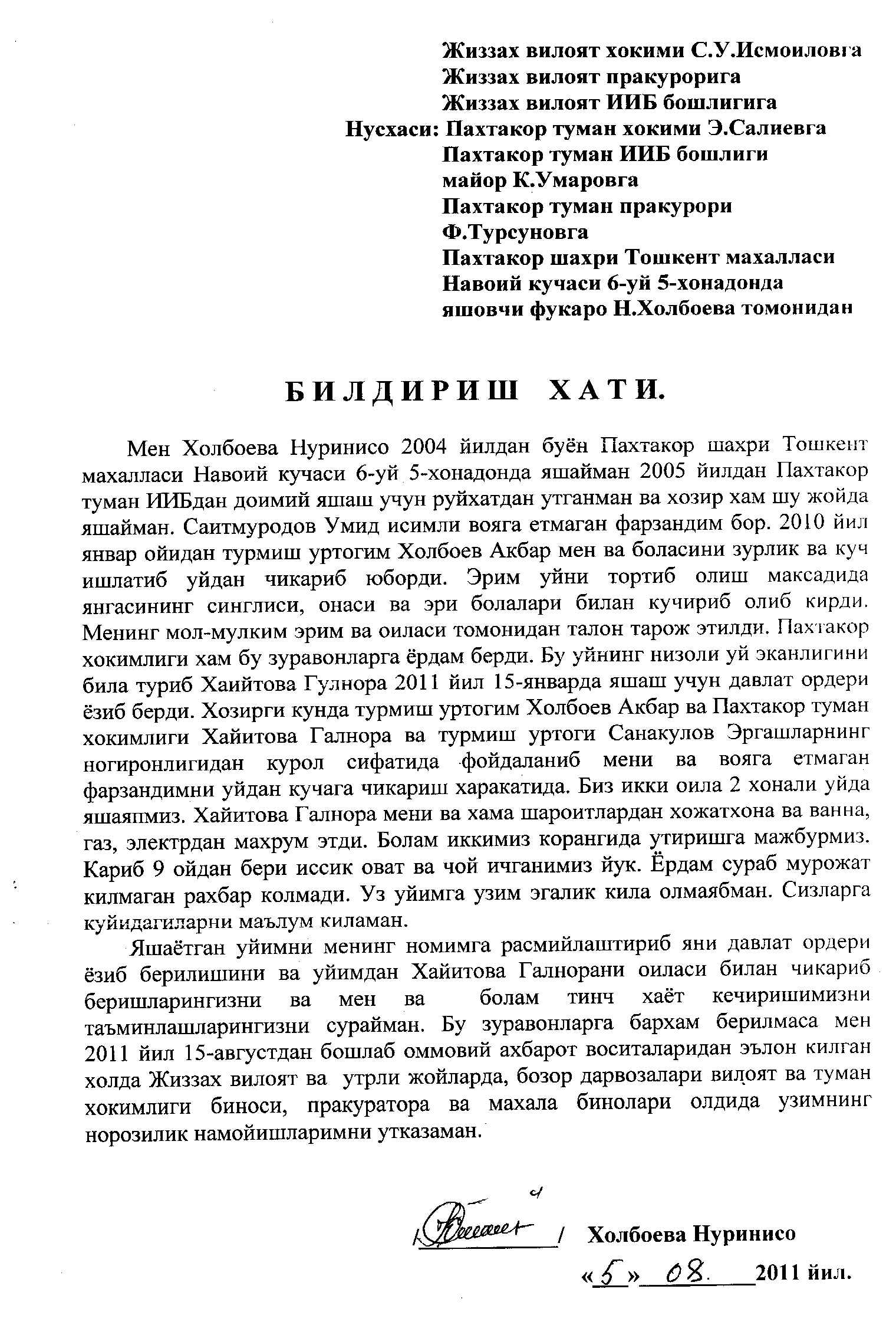 Мен, Холбоева Нуринисо 2004 йилдан буён Пахтакор шаҳри, Тошкент маҳалласи, Навоий кўчаси 6- уй 5- хонадонда яшайман. 2005 йилдан Пахтакор тумани ИИБ сидан доимий яшаш учун рўйхатдан ўтганман ва ҳозир ҳам шу жойда яшайман. Саитмуродов Умид исмли вояга етмаган фарзандим бор. 2010 йил январ ойидан турмуш ўртоғим Холбоев Акбар мен ва боласини зўрлик ва куч ишлатиб уйдан чиқариб юборди. Эрим уйни тортиб олиш мақсадида янгасининг синглиси,онаси ва эри болалари билан кўчириб олиб кирди. Менинг мол -мулким эрим ва оиласи томонидан талон -тарож этилди. Пахтакор ҳокимлиги ҳам бу зўравонларга ёрдам берди. Бу уйнинг низоли уй эканлигини била туриб Хаитова Гулнора 2011 йил 15 январда яшаш учун давлат ордери ёзиб берди. Ҳозирги кунда турмуш ўртоғим Холбоев Акбар ва Пахтакор туман ҳокимлиги Хаитова Гулнора ва турмуш ўртоғи Санакулов Эргашларнинг ногиронлигидан қурол сифатида фойдаланиб мени ва вояга етмаган фарзандимни уйдан кўчага чиқариш ҳаракатида. Биз икки оила икки хонали уйда яшаяпмиз. Хаитова Гулнора мени ва боламни хамма шароитлардан ҳожатхона ва ванна, газ, электрдан маҳрум этди. Болам иккимиз қоронғуда ўтиришга мажбурмиз. Қарийиб 9 ойдан бери иссиқ овқат ва чой ичганимиз йўқ. Ёрдам сўраб мурожаат қилмаган раҳбар қолмади. Ўз уйимга ўзим эгалик қила олмаяпман. Сизларга қуйидагиларни маълум қиламан.