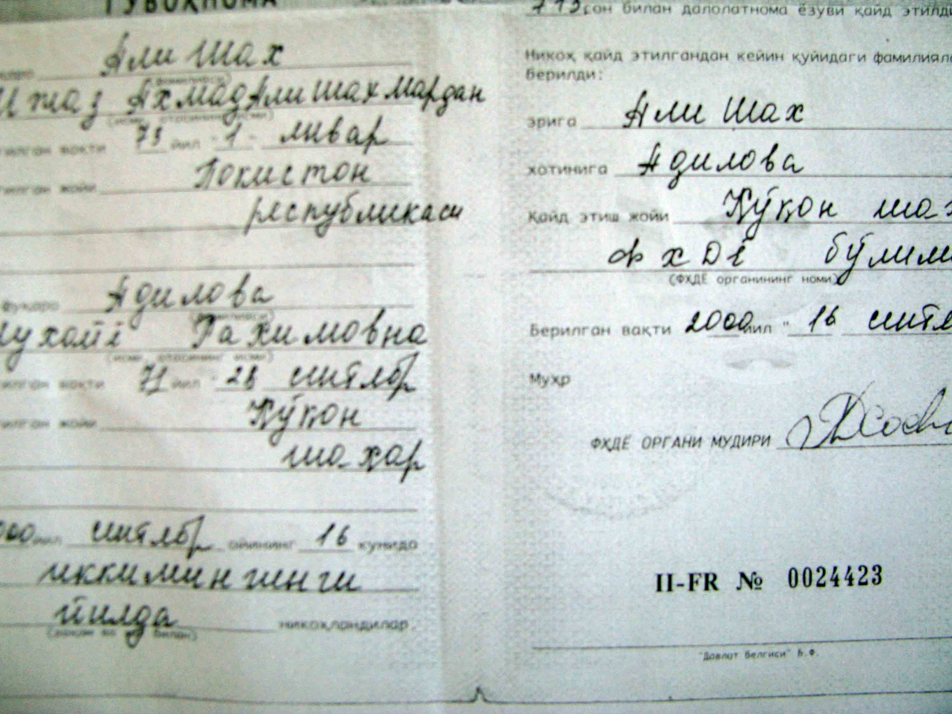 области Алиханов Рахмон. Во время обыска по приказу следователя Хужамкулова меня раздели до гола трое мужчин, хотя я официально являюсь законной женой гражданина Исламской Республики Пакистан Али
