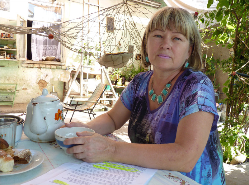 «Соседка Татьяна Довлатова – сама инвалид. И еще вынуждена содержать парализованного брата. Когда-то он был здоровым человеком, художником, делал гобелены (Татьяна разворачивает его работы). Потом нанялся строить особняк местному баю из милиции. В итоге брата обманули и ничего не заплатили. Довлатова: «Он сказал: «А наркоты в карман не хочешь, какие тебе деньги?» В общем, он приехал домой, понервничал, его всего трясло – его инсульт шарахнул».