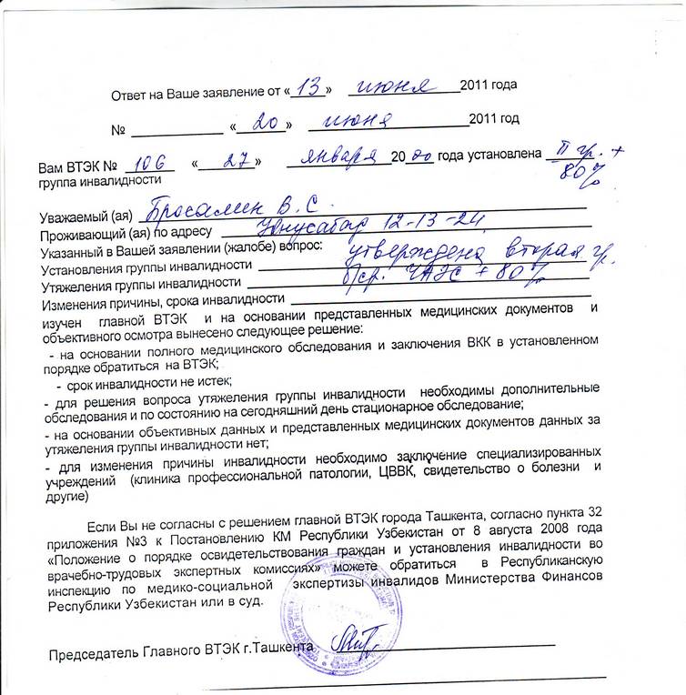 20.06.2011 года нам позвонили из ВТЭК г. Ташкента, при приезде туда, мне предоставили ответ о том, что утверждена 2 группа инвалидности бессрочно ЧАЭС и 80 %. А в дело было подключено постановление и указано из Олий Мажлиса. А что Мин. Фин. Р.Уз. не знал, что инвалидов Чернобыльской АЭС и Афганистана не имели право направлять с бессрочной инвалидностью на ВТЭК, тем более что в Указе об этих инвалидах не говорилось ничего. Нет, они хорошо все знали, но Мин. Фин. Р.Уз. надеялся на незнания своего народа, и что это у них сойдет.