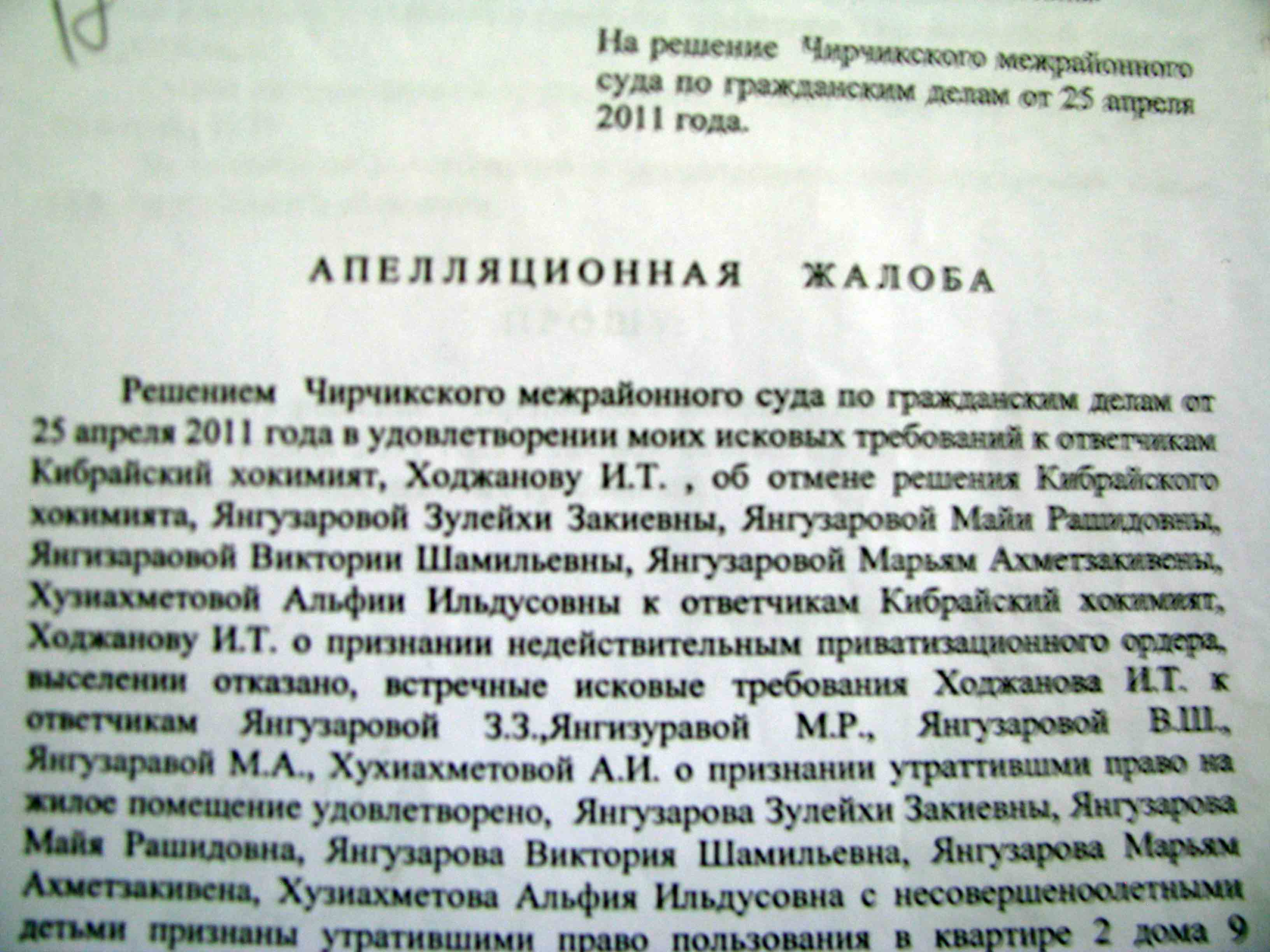 Зулейха осталась без жилья, так как хокимият по другому ордеру вселил