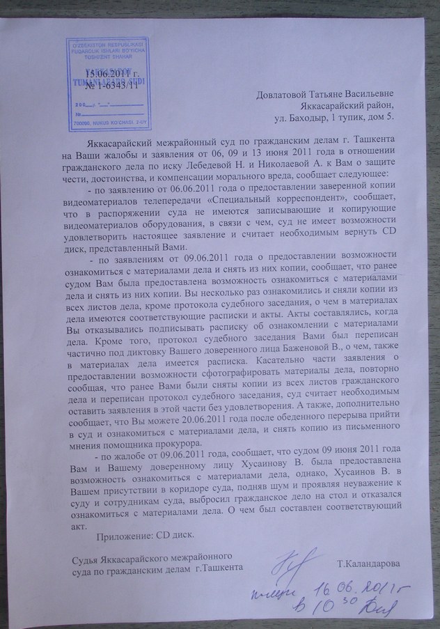 Но по этому иску к Татьяны Довлатовой с самого начало было понятно, что на судью надавили власти и по поведению прокурора с привлечение судебных исполнителей + уголовный розыск сразу было понятно, что это месть Узбекских властей за показ по телевидению России-1 24 апреля 2011 года передачи специальный корреспондент «Без России».