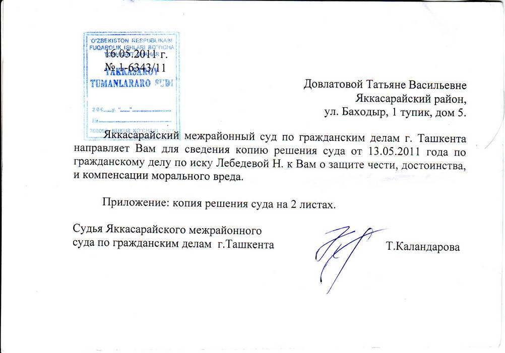 Судья Каландарова Б.Т. из яккасарайского межрайсуда по гражданским делам города Ташкента вынесла решение в отношении узбекской правозащитницы Татьяны Довлатовой. Ей для этого хватило одного заседания (30-40 минут). И не смотря на то, что Татьяна Довлатова не смогла, ознакомится с материалами по иску, не смогла воспользоваться услугами адвоката, не смогла выступить на суде в свою защиту – так как судья вместе с прокурором препятствовали этому.