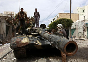 На восточном фронте, где правительственные войска стоят на подходах к Адждабии, от которой открывается дорога на столицу повстанцев Бенгази, без перемен. В пятницу и в ночь на субботу значительных столкновений не было. Пока что авиация стран НАТО при поддержке Катара и ОАЭ продолжает наносить ограниченные ракетно-бомбовые удары по позициям правительственных войск. По оценкам, сделанным в Багдаде главой Объединенного комитета начальника штабов ВС США адмирала Майка Маллена, силам антикаддафиевской коалиции и НАТО удалось уничтожить от 30% до 40% военного потенциала диктатора, но сам конфликт заходит в тупик.