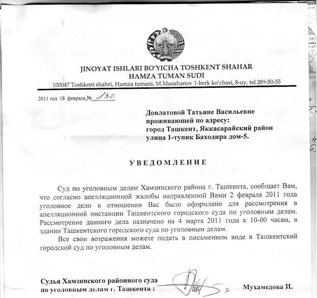 Узбекская правозащитница Татьяна Довлатова приглашает 4 марта 2011 года к 10 часам утра всех желающих в Ташгорсуд по уголовным делам по адресу Улица Навои 23. ориентир метро Пахтакор или телецентр.