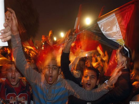 Пойтахт Қоҳиранинг Таҳрир майдонига йиғилган юз минглаб намойишчи Муборакнинг истеъфосини байрамона руҳда кутиб олди. Халқ 30 йиллик мустабидликдан қутулганини қувонч кўз ëшлари билан қарши олмоқда.