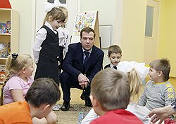 30 ноября в послании Федеральному собранию главной на 2011 год была объявлена тема детей. За две недели Дмитрий Медведев уже несколько раз к ней возвращался. Например, 14 декабря в Сколково на открытом заседании комиссии по модернизации в рамках форума «Россия, вперед!» он долго обсуждал проблемы школьного образования. В четверг в Рязани на совещании по вопросам обеспечения правопорядка Дмитрий Медведев говорил о воспитании и наказании малолетних правонарушителей. Вчера дошла очередь и до дошкольников. Президент посетил продвинутый детский сад N 1524, в котором были и бассейн, и компьютерный класс, и спортивный и танцевальный залы, а также специальные классы для занятий с детьми с нарушениями развития.