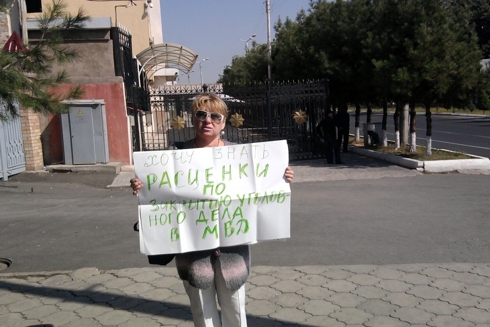 К Татьяне Довлатовой, которая пикетировала около здания МВД первыми приехали работники из СНБ (люди Иноятова). Милиционеры (Матлюбова) опоздали и не успели выхватить плакаты из рук правозащитницы.