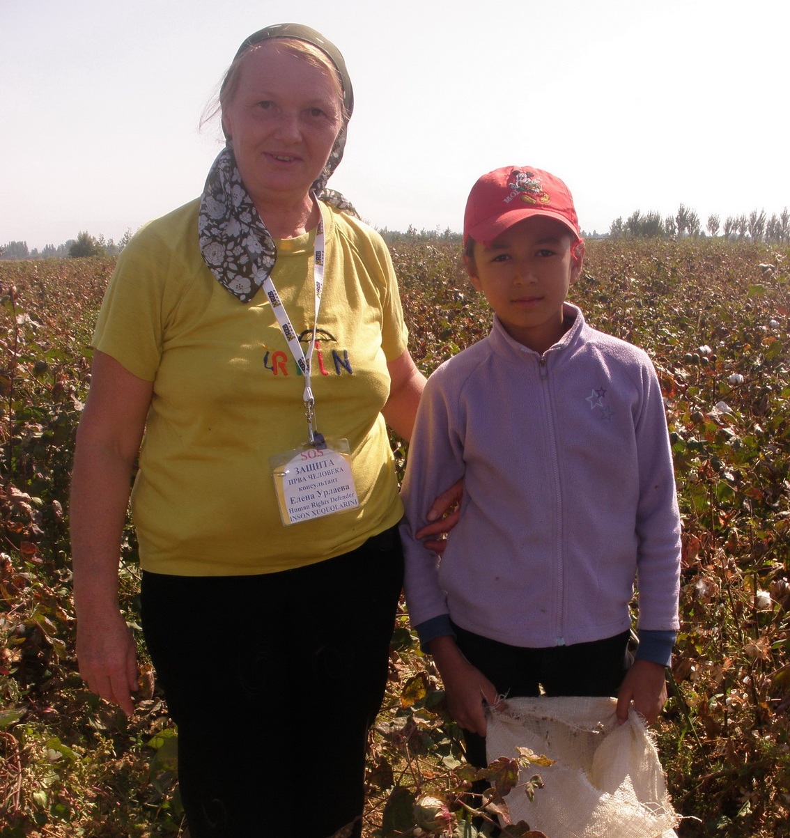 скорую помощь и через некоторое время она опять стала собирать хлопок. Учителям и детям властями запрещено обращаться к медикам во время сбора хлопка. Хлопковые поля в этом районе закреплены за каждой школой и находятся они недалеко от школ. Я делала фотоснимки на полеучастка «Узбекистон» рядом с махаллей «Марказ», это поле закреплено за школой 34. Директор этой школы по имени Анна сразу вызвала сотрудников спецслужб , некоторые из них были в комуфляжной одежде. Как мне сообщили учителя и дети, каждое поле с детьми охраняется отрядями из представителей хокимията, прокуратуры, милиции, и детям и учителям запрещено говорить об этом принудительном труде. Я сама поднимала мешок схлопком и он был достаточно тяжелым. Я успела показать книгу «Права человека и ты» и сказать собравшимся детям и директору школы 34, что дети должны учиться и отдыхать, но меня потащила директор школы 34 к приехавшим через минут 5 сотрудникам спецслужб.