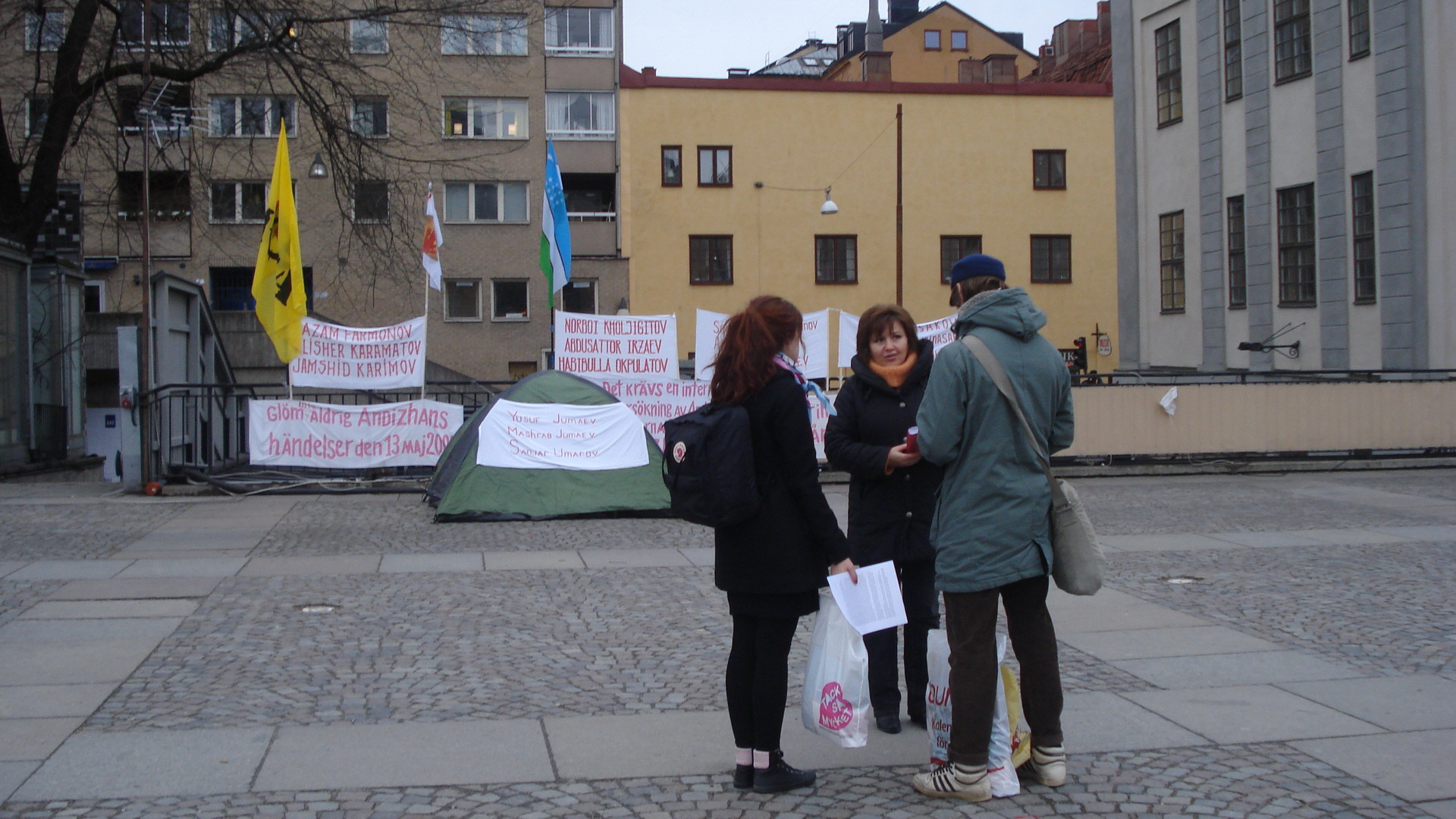 «Бирдамлик» ҳаракати фаоллари томонидан Швеция пойтахти Стокҳолм шаҳрида Ўзбекистон қамоқхоналарида ноҳақ жазо муддатини ўтаётган сиёсий махбусларни озод этишни талаб қилиб ўтказилаётган узлуксиз норозилик намойиши 3 март куни соат 10 дан кеч соат 6 гача давом этди.